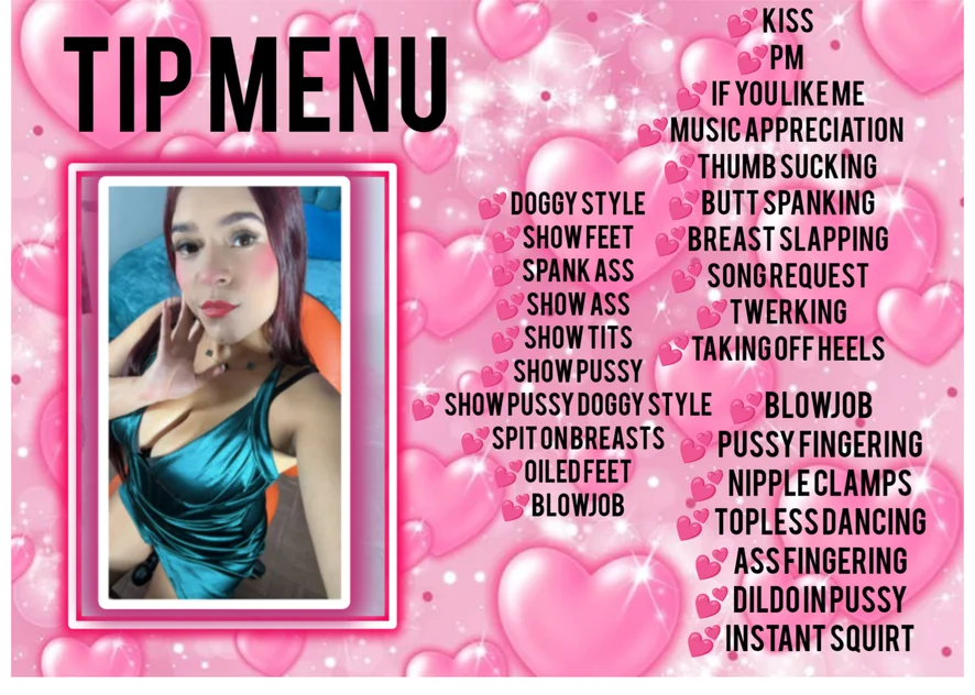 Spanking, Erotic Dance, Camel Toe, Dirty Talk, Doggy Style, Creampie, Fingering, Striptease, Sex Toys, Topless, Dildo or Vibrator, Deepthroat, Blowjob, Masturbation, Orgasm, Oil Show, Nipple Toys, Tittyfuck, Cowgirl